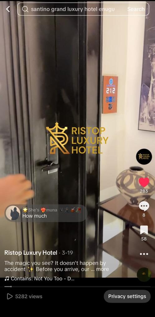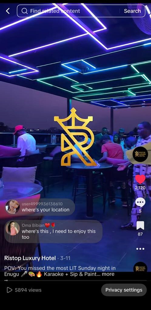 Since Ristop Luxury Hotel's launch, we've managed their entire social media presence—from strategy development to content creation, shooting, editing, and posting across all platforms. Our consistent approach has helped the hotel achieve thousands of views and likes, significantly boosting their visibility and driving sales. Through creative storytelling and strategic content planning, we've kept Ristop relevant and top-of-mind in Enugu's competitive hospitality scene.